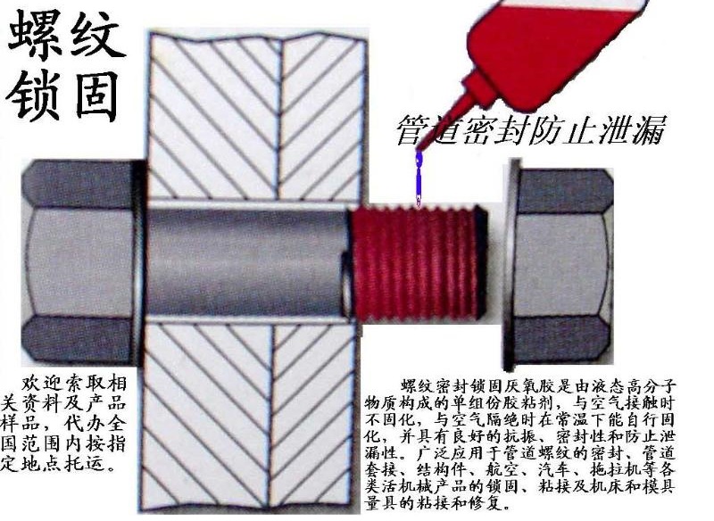 (1) apriete los hilos. Los tornillos metálicos son propensos a aflojar o desconectarse debido a la vibración de impacto, y los métodos tradicionales de bloqueo mecánico no son ideales, mientras que los métodos de bloqueo químico son baratos y efectivos. Si el tornillo se aplica con pegamento anaeróbico y se ensambla, se forma una película plástica fuerte en el hueco del hilo después de la curación, de modo que el bloqueo del tornillo no se afloje. Ahora ya hay un pegamento anaeróbico precotizado, precotizado en el tornillo, colocado en espera de uso (válido por cuatro años), siempre y cuando el tornillo se atornille, se puede lograr el efecto anti - aflojamiento esperado.