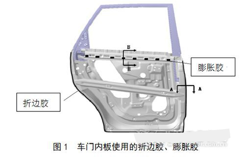 折边胶主要用于车门、引擎盖和行李箱盖外板的包边,代替焊点连接内、外盖板,避免车身表面出现焊接而造成的凹坑,提高车身的外观质量。如图1所示,折边胶断面尺寸为直径约3mm的半圆弧,半圆弧圆心离外板内表面边界约2.5mm。