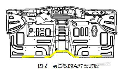 点焊密封胶主要用于前围、侧围和地板等处的密封,以实现防水、防尘和防锈,并防止灰尘等进入接头部位,如图2所示。点焊密封胶的断面尺寸为直径约3mm的半圆弧,圆心离边界7mm。