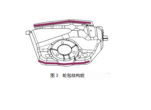 结构胶主要用于外板件和外板加强件之间的密封连接,用来替代点焊(外板表面不允许有焊点或可焊性差),提高刚度和密封,防止水、灰尘等进入车身内部,所以要求粘结强度高。结构胶的断面尺寸为直径约3mm的圆,胶涂在距离零件边缘7mm左右的位置,如图3所示。