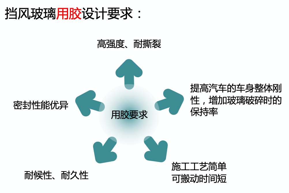 挡风玻璃的粘接与密封是汽车总装工序很重要的一道工序,用胶要求也很严格,要求密封胶具有高强度、耐撕裂,密封性能优异,能够提升汽车车身整体的刚性,而且在使用过程中还要求耐候性及耐久性优异。