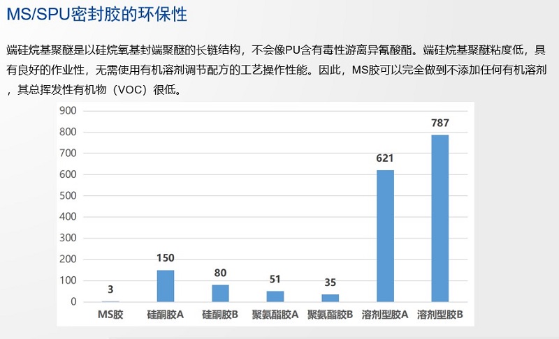 传统的密封胶(硅酮胶)因含有溶剂,会释放出甲醛、VOC(挥发性有机物)等危害人的身心健康。MS 胶 不含甲醛和异氰酸酯,无溶剂、无毒、无味、VOC 释放远远低于国家标准,是最环保的建筑胶产品。